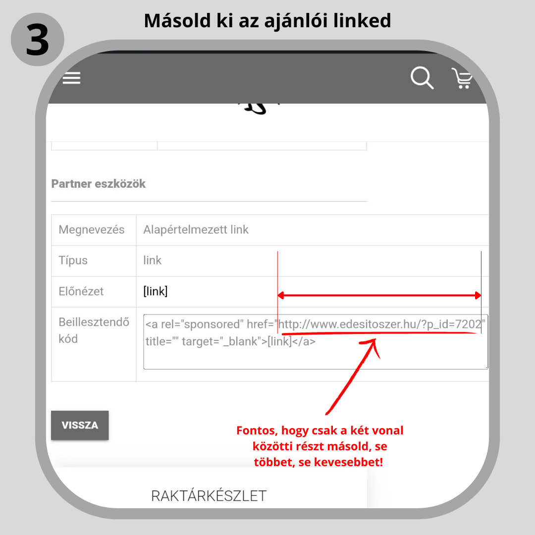 3, Görgess lentebb, amíg meg nem találod a "Partner eszközök" részt. Másold ki a személyes ajánlói linkedet, az alábbi kép alapján (Fontos, hogy csak a két piros vonal közötti részt másold ki, ne többet, ne kevesebbet):